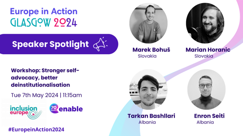 Stronger self-advocacy, better deinstitutionalisation will be presented by Marek Bohuš and Marian Horanic, ZPMP v SR, Slovakia Tarkan Bashllari and Enron Seiti, Help the Life, Albania Self advocacy will be explained.