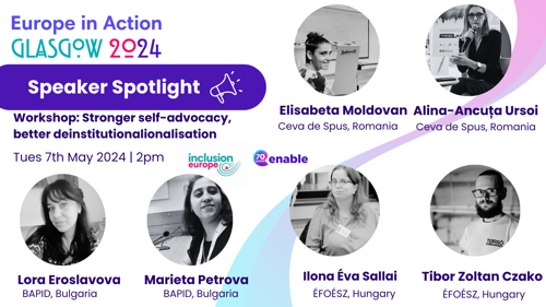 Spus, Romania Ilona Éva Sallai and Tibor Zoltan Czako, ÉFOÉSZ, Hungary, Lora Sapcheva Eroslavova and Marieta Emilova Petrova, BAPID, Bulgaria will present stronger self-advocacy, better deinstitutionalisation.